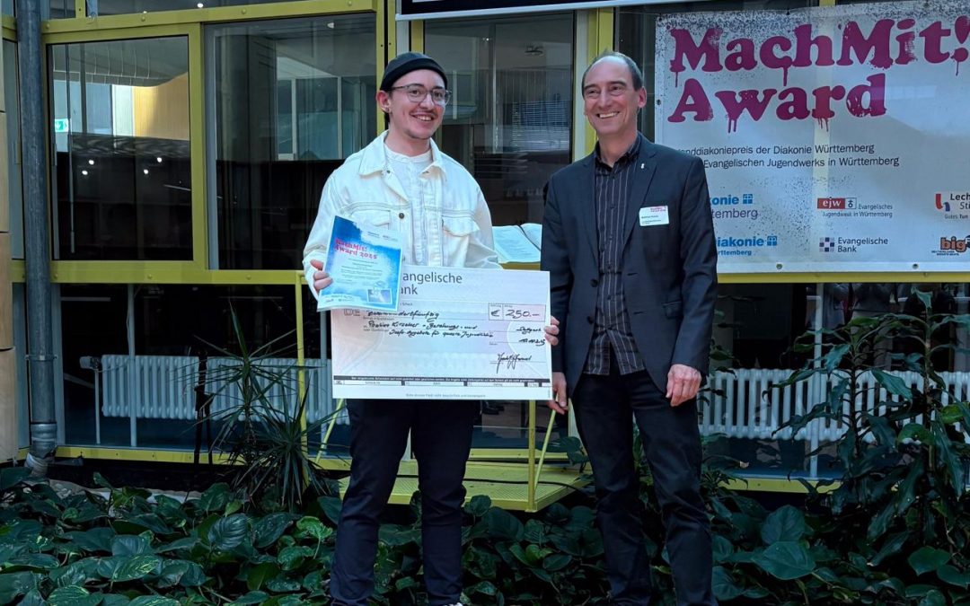 Über den 3. Platz beim Jugenddiakoniepreis durfte sich in diesem Jahr Paulino Kirschner freuen, der beim Ulmer Kinder- und Jugendhilfeverein Oberlin eine Ausbildung zum Jugend- und Heimerzieher absolviert. Der „MachMit! Award“, der jährlich von der Diakonie Württemberg und dem Württembergischen Evangelischen Jugendwerk vergeben wird, rückt soziales Engagement von jungen Menschen ins öffentliche Licht. Mit seiner ehrenamtlichen Tätigkeit, queere Jugendliche zu beraten und Präventionsangebote für sie zu schaffen, konnte Paulino Kirschner die Jury überzeugen und wurde für sein außergewöhnliches Empowerment bei der kürzlichen Preisverleihung in Stuttgart entsprechend gewürdigt.